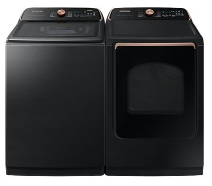 Samsung® Black Stainless Steel Top Load Laundry Pair with a 6.2 cu. ft. capacity top load washer and a 7.4 cu. ft. capacity front load electric dryer.Read More