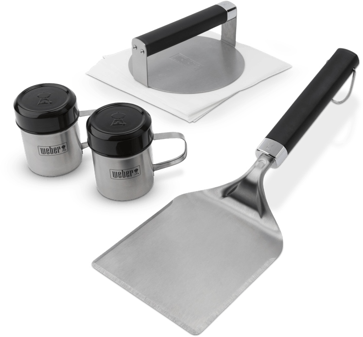 Includes: Smashed Burger Press, patty paper, wide spatula, and two seasoning shakers